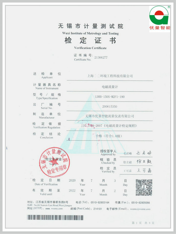 無(wú)錫優(yōu)量電磁流量計(jì)由無(wú)錫市計(jì)量測(cè)試中心頒發(fā)校準(zhǔn)證書,權(quán)威官方校準(zhǔn)認(rèn)證確保優(yōu)量電磁流量計(jì)精準(zhǔn)可靠