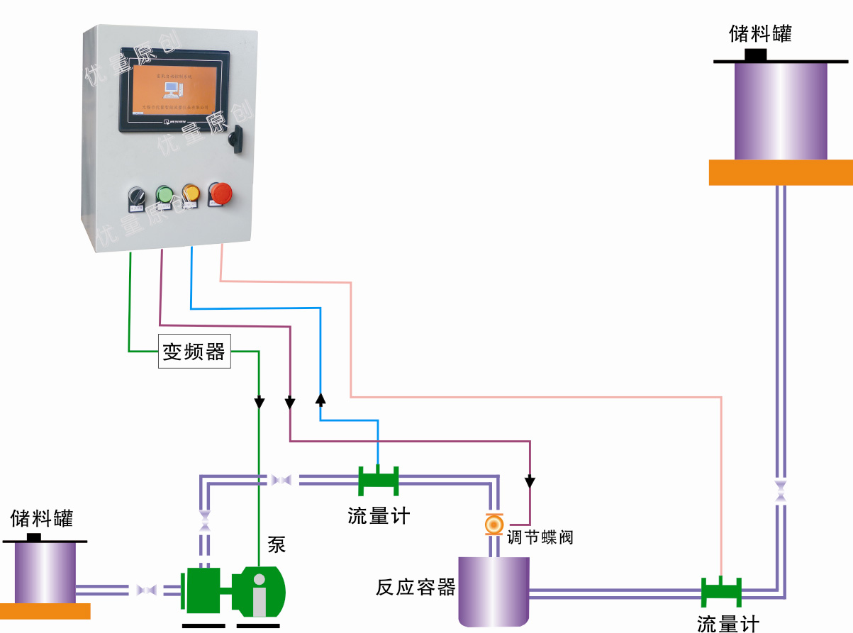 流量控制:西門子PLC+觸摸屏設(shè)定加料的數(shù)量,進(jìn)行流量比例反應(yīng)。電話:0510-82026888 83118288